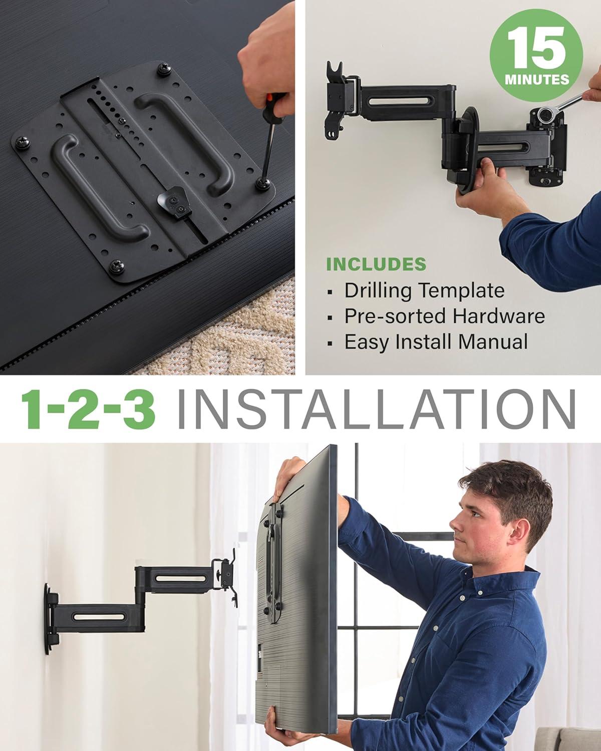 Full Motion Views: With 90 degrees of swivel and 15 degrees of tool-free tilt, you'll get the best, glare-free view from any angle. Want to keep it sleek? Push your TV back to just 1.8″ from the wall, or pull it out 17″ to maximize you mount's full motion range. Now you're ready for movie night